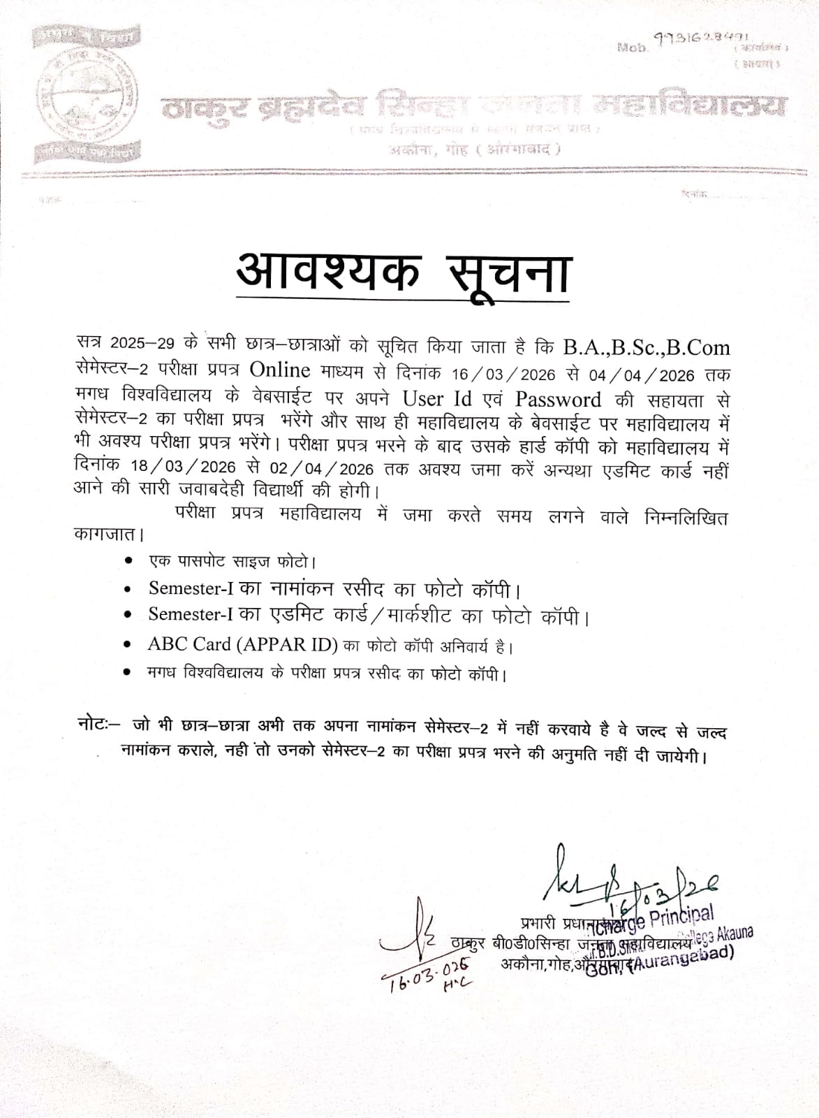 NOTICE REGARDING UG 2ND SEM EXAMINATION FORM 2025-29